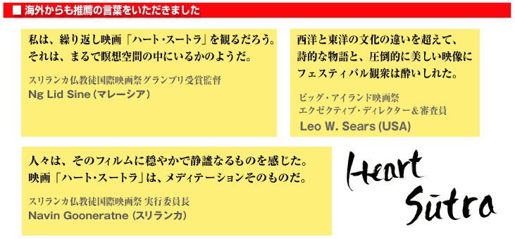 「すべてはひとつ」 ・・・その大いなる慈愛と調和の仏教的精神を ベースに創られた2つのストーリー 「ハート・スートラ」は 東洋で最も人気のある経典のひとつ 般若心経の「空 くう」の世界をエネルギー論で解き明かしている。 バリ島随一の歌舞団、プリアタン歌舞団をフューチャーして インドネシア・バリ島、シンガポール、日本でロケ敢行した2009年度作品 「空 ザ・ヴォイド」は 欧米でも高く評価されている三代真史ジャズ舞踊団の 注目のダンサー、乗倉奈津美の 「天使飛翔」を思わせるダンスと 透明感溢れる映像で表現した映像詩 2010年度作品 アマゾンでも好評発売中!