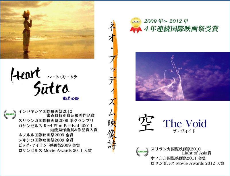「ハート・スートラ〜般若心経〜」 インドネシア国際映画祭2012 審査員特別賞&優秀作品賞 スリランカ国際映画祭2009 準グランプリ ホノルル国際映画祭2009 Gold Kahuna Award(金賞) メキシコ国際映画祭2009 Gold Palm Award(金賞) ハワイ・ビッグアイランド映画祭2009 Golden Honu Award(金賞) ロサンゼルス Movie Awrads2011 入賞 ロサンゼルス Reel Film Festival2011 最優秀作曲賞&作品賞入賞 タイ国際映画祭 公式ノミネート フロリダ・デルレイビーチ映画祭 公式ノミネート イギリス・スワンジーベイ国際映画祭 公式ノミネート ハート・オブ・イングランド国際映画祭 公式ノミネート アイルランド国際映画祭 公式ノミネート 南アフリカ国際映画祭 公式ノミネート イリノイ・ルート66映画祭 公式ノミネート エジプト国際映画祭 公式ノミネート サンバレイ・スピリチュアル映画祭 公式ノミネート フロリダ・インディペンデント映画祭 公式ノミネート アメリカ/テレビ放送「エデュケーションチャンネル」で放送 「空 The Void」 スリランカ国際映画祭2010 Ligt of Asia賞 ホノルル国際映画祭2011 Gold Kahuna Award(金賞) ロサンゼルス Movie Awards2012 入賞 アフリカ国際映画祭公式ノミネート サンバレイ・スピリチュアル映画祭 公式ノミネート